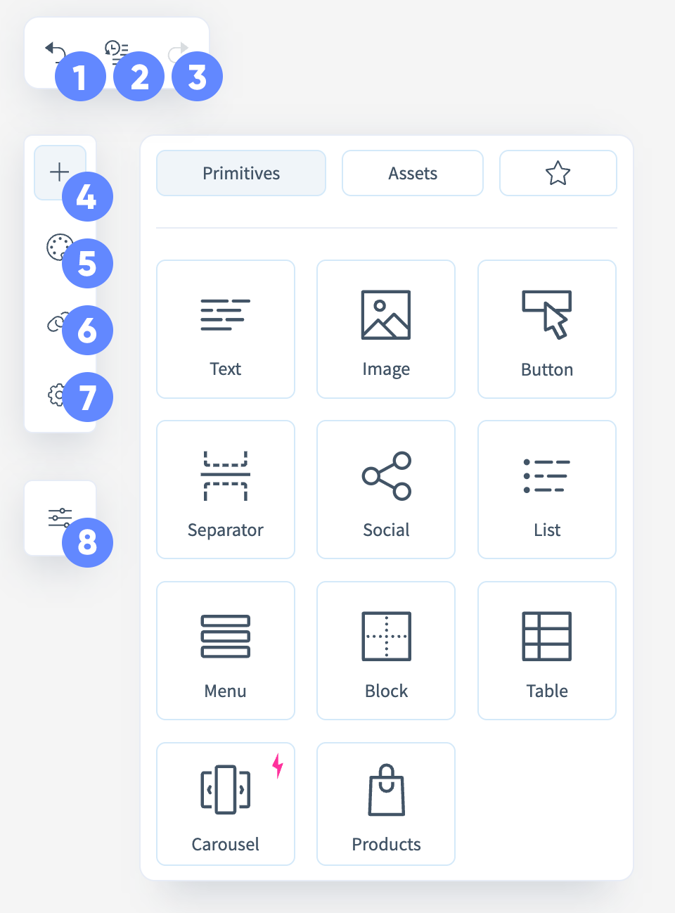 - Add — opens the menu of primitives and ready-made blocks for inserting into the template;