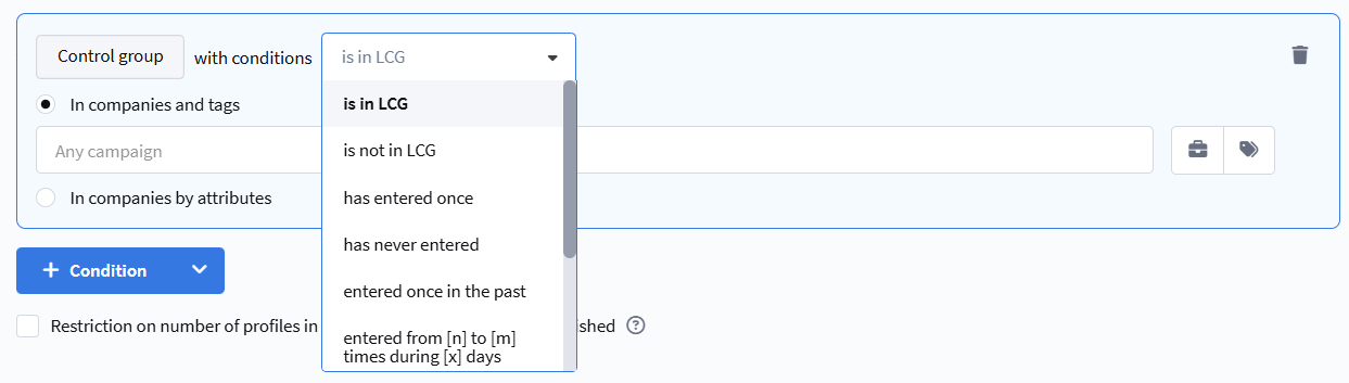- never entered during [x] days — the profile has not entered the control group in the last X days.