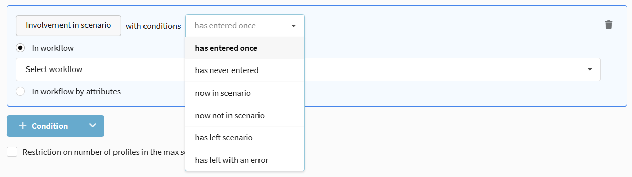 Segmentation by participation in automation scenarios. Allows selecting profiles that are in a scenario, have completed it, or exited with an error.