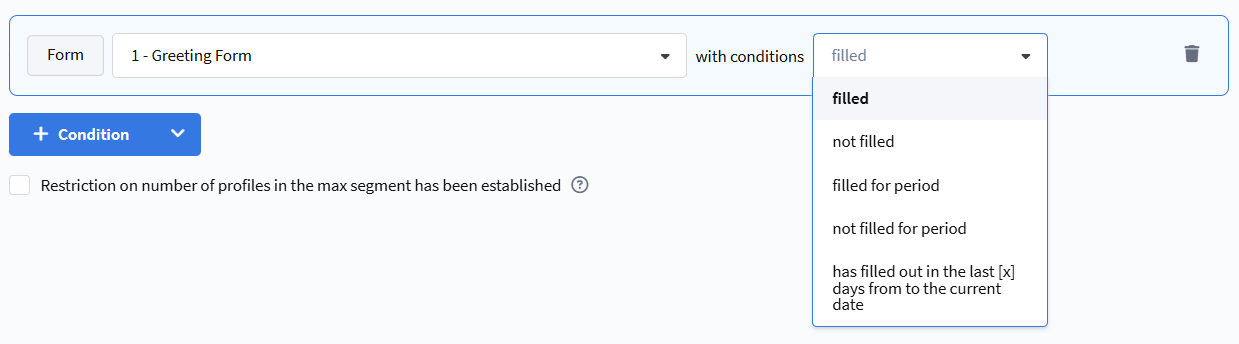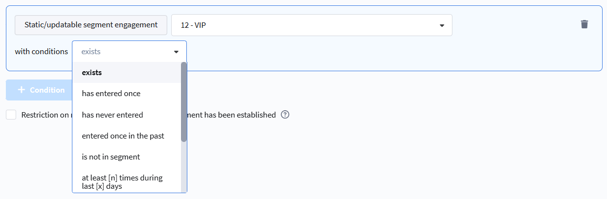 - entered once in the past — the profile is currently not in the segment but was in it previously.