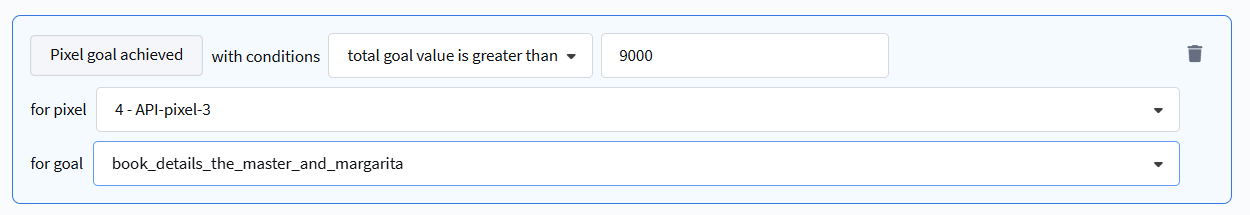 - Meets / Does not meet complex condition — extended selection based on additional data passed when registering a goal via API.