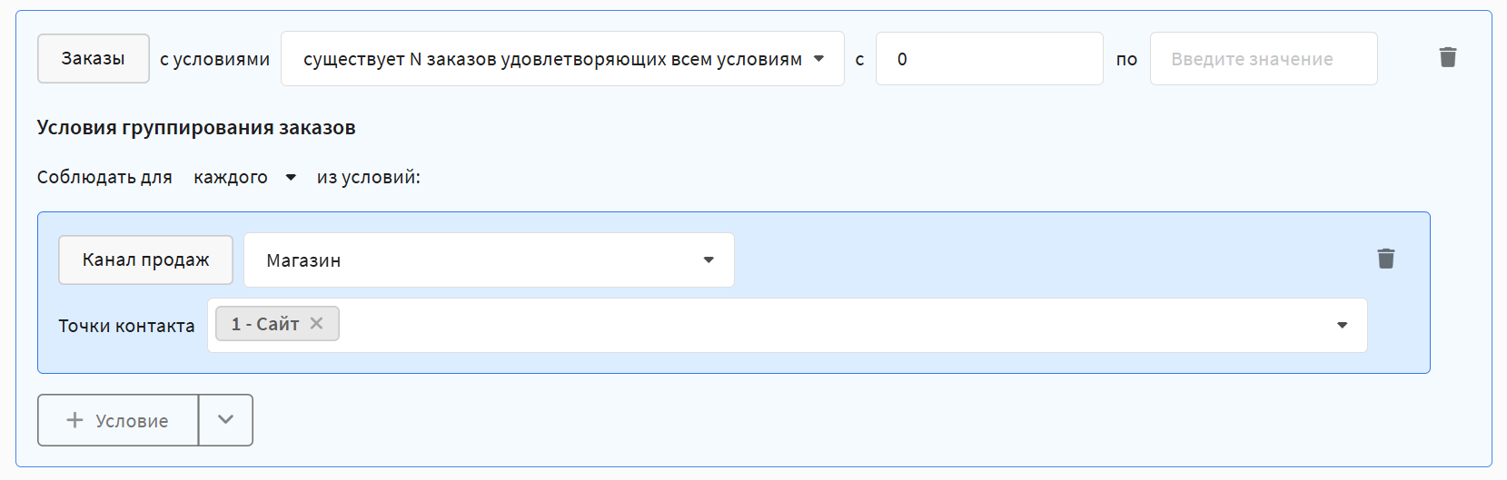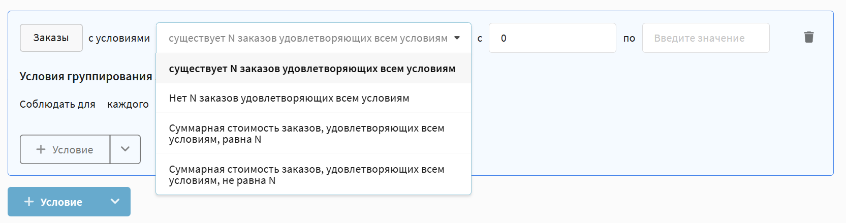 In any of the rules described above, you can set additional conditions to specify which orders to take into account. The following parameters are available: