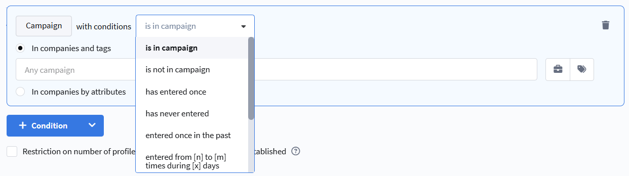 - entered at least [n] times in the last [x] days — the profile entered the campaign the specified number of times in the last X days.