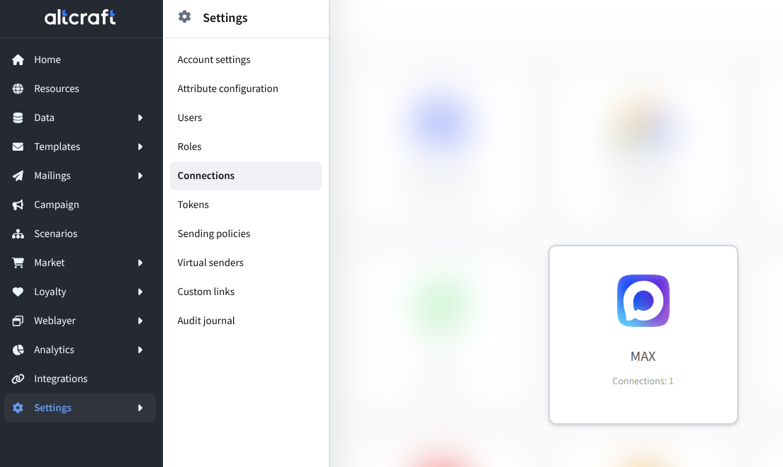 Then go to the Altcraft platform. Open Settings — Connections. Select the connection type — MAX: