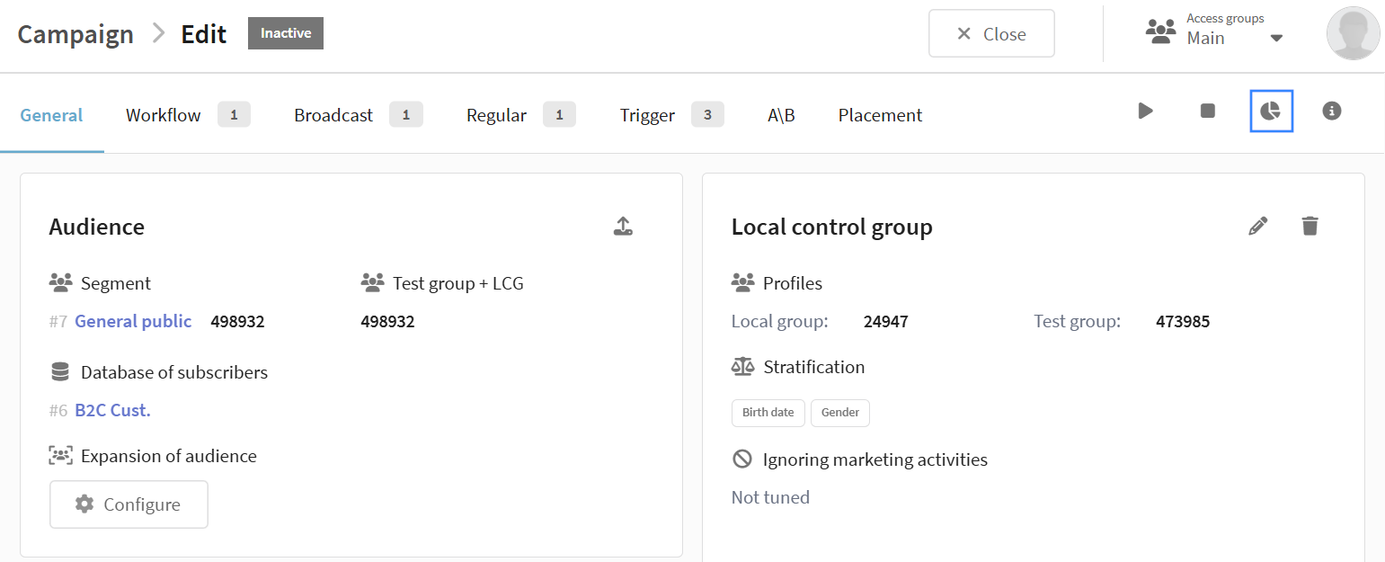 The Local control group (LCG) is a part of the audience that does not receive campaign activities. Used for precise audience control. LCG analytics is not available yet.