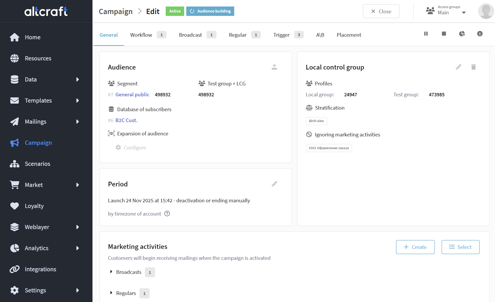 Campaigns are a tool for uniting marketing activities into a single strategy and managing them in one place. A campaign can contain broadcasts, regular and triggered mailings, scenarios, A/B tests and placements. You can configure test and control groups, track strategy performance and manage the lifecycle of activities from a single interface: