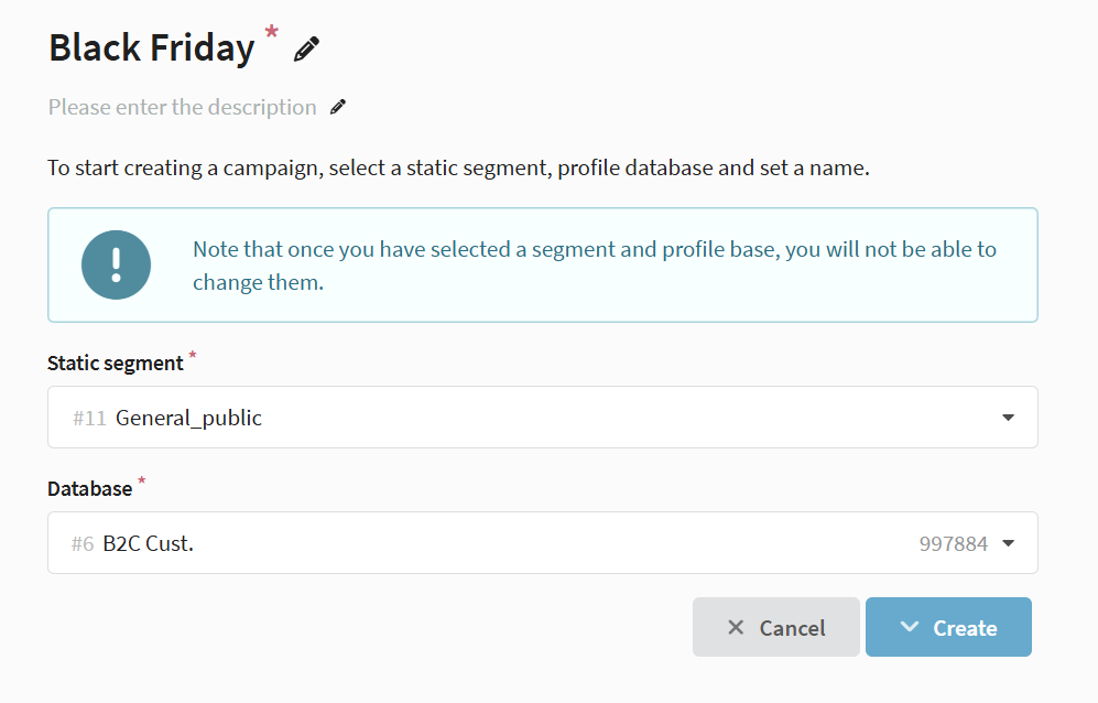 Before creating a campaign, prepare a static or updatable segments for the target audience. It defines who will join the activities.