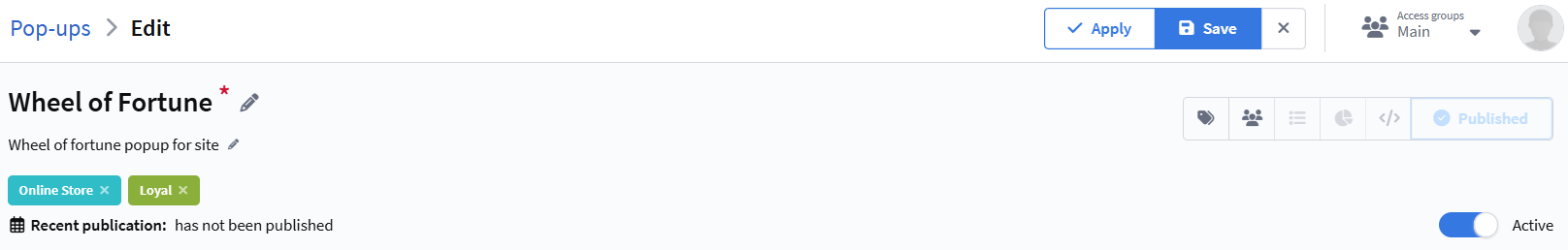 After you finish configuration, save the pop-up and make sure its status is Active.