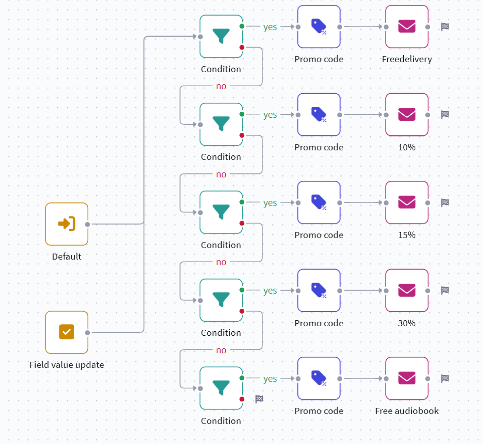 Repeat this logic for each prize, creating a chain of conditions and matching actions to assign promo codes and send emails: