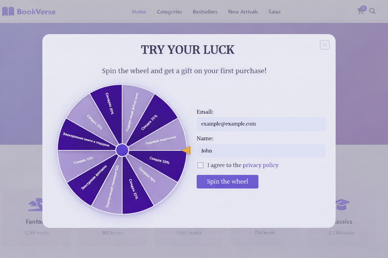 The special "Wheel of Fortune" widget lets you create an interactive pop-up that engages website visitors with a prize game. A user fills out a simple form and spins the wheel to receive a random gift: a discount, a promo code, or another bonus. This guide describes how to create such a pop-up in the Altcraft builder: