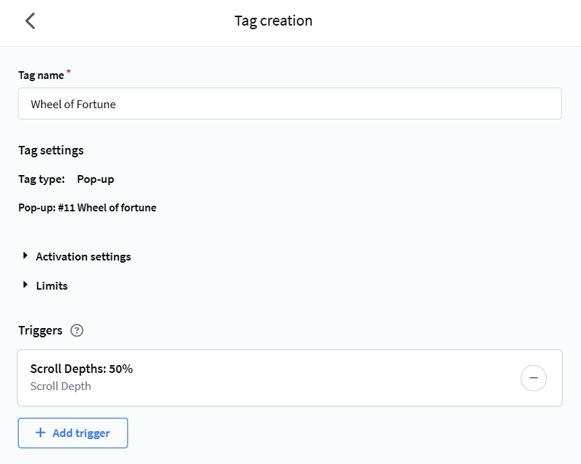 Set the tag Name and configure the trigger — the condition that shows the pop-up (for example, Timer or Scroll depth):