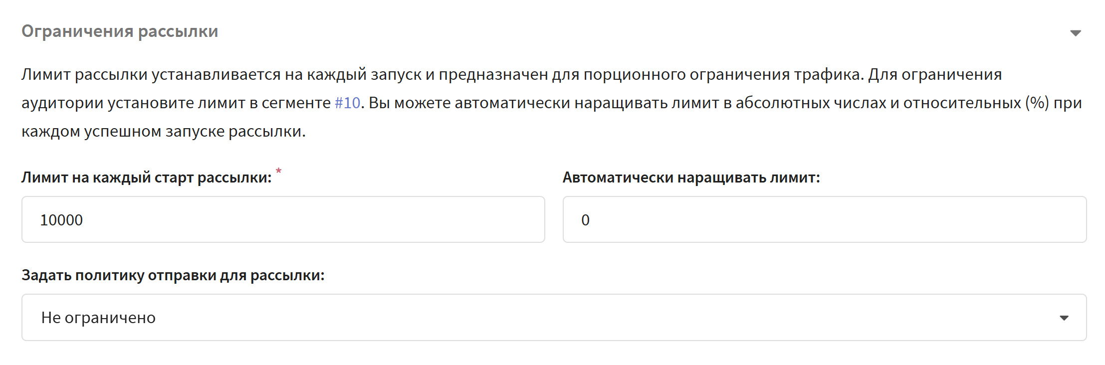 Политика отправки ограничивает коммуникацию с одним подписчиком. Настраивается для рассылки в блоке Ограничения рассылки (см. предыдущий пункт). По умолчанию рассылка будет использовать политику, выбранную глобально в аккаунте или в ресурсе, от имени которого отправляется регулярная рассылка.