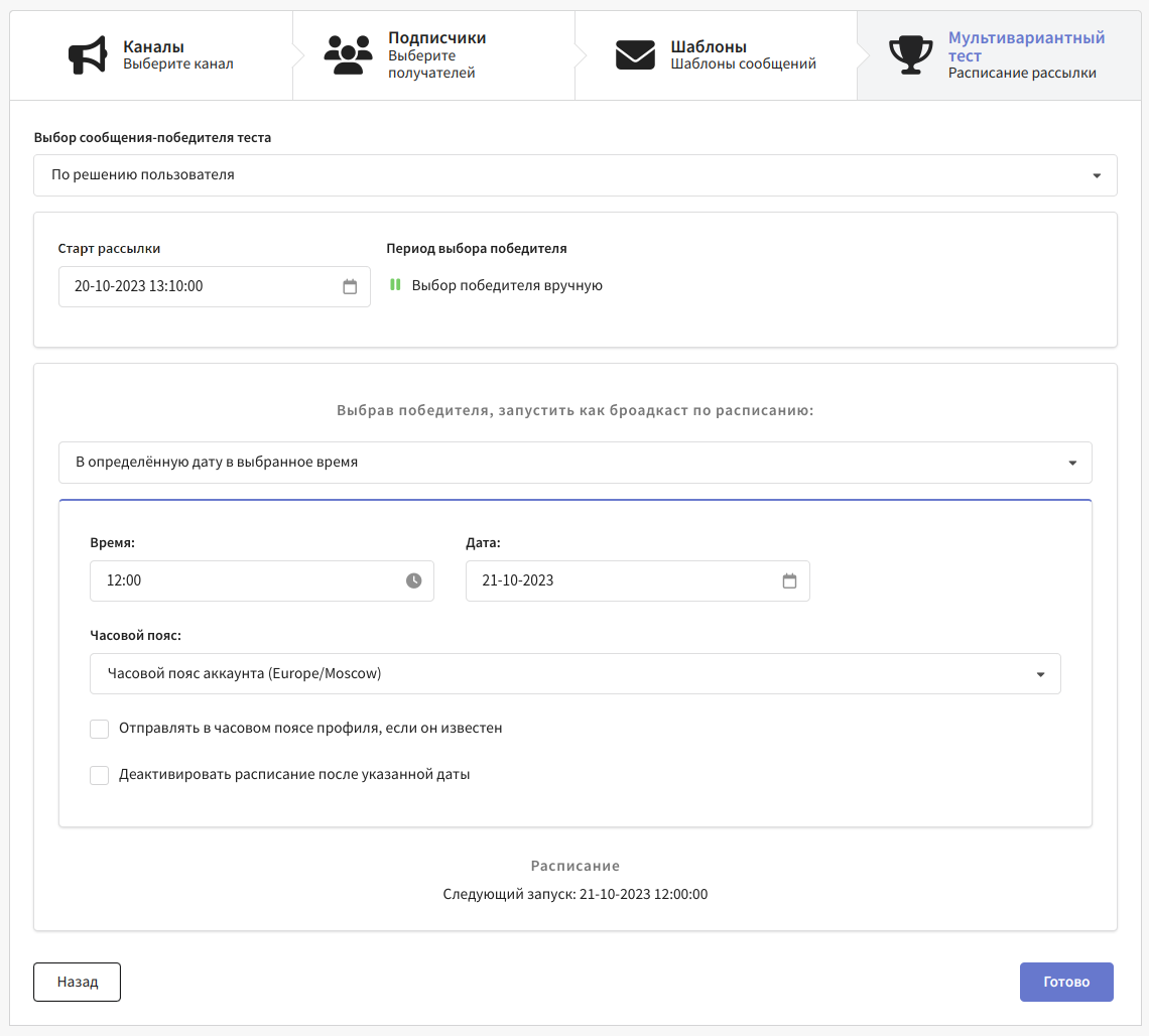 Если при настройке расписания вы выбираете часовой пояс, отличный от пояса аккаунта, то по этому часовому поясу отправится только рассылка с шаблоном-победителем. Тестовые сообщения отправятся по часовому поясу аккаунта.