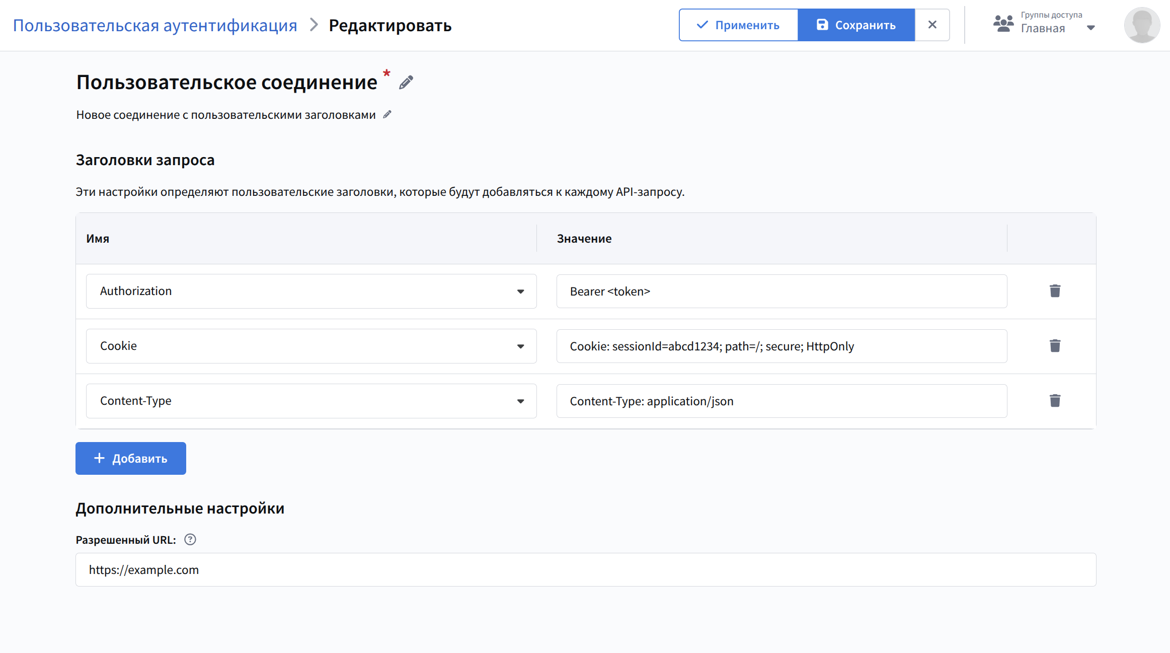 Добавлен новый вид коннекторов для внешних подключений — Custom Authentication. Такое подключение позволяет настроить пользовательские HTTP-заголовки для API-запросов, включая предустановленный заголовок Authorization. Это решение предоставляет гибкость в настройке и отправке API-запросов, а также поддерживает валидацию и обработку ошибок.