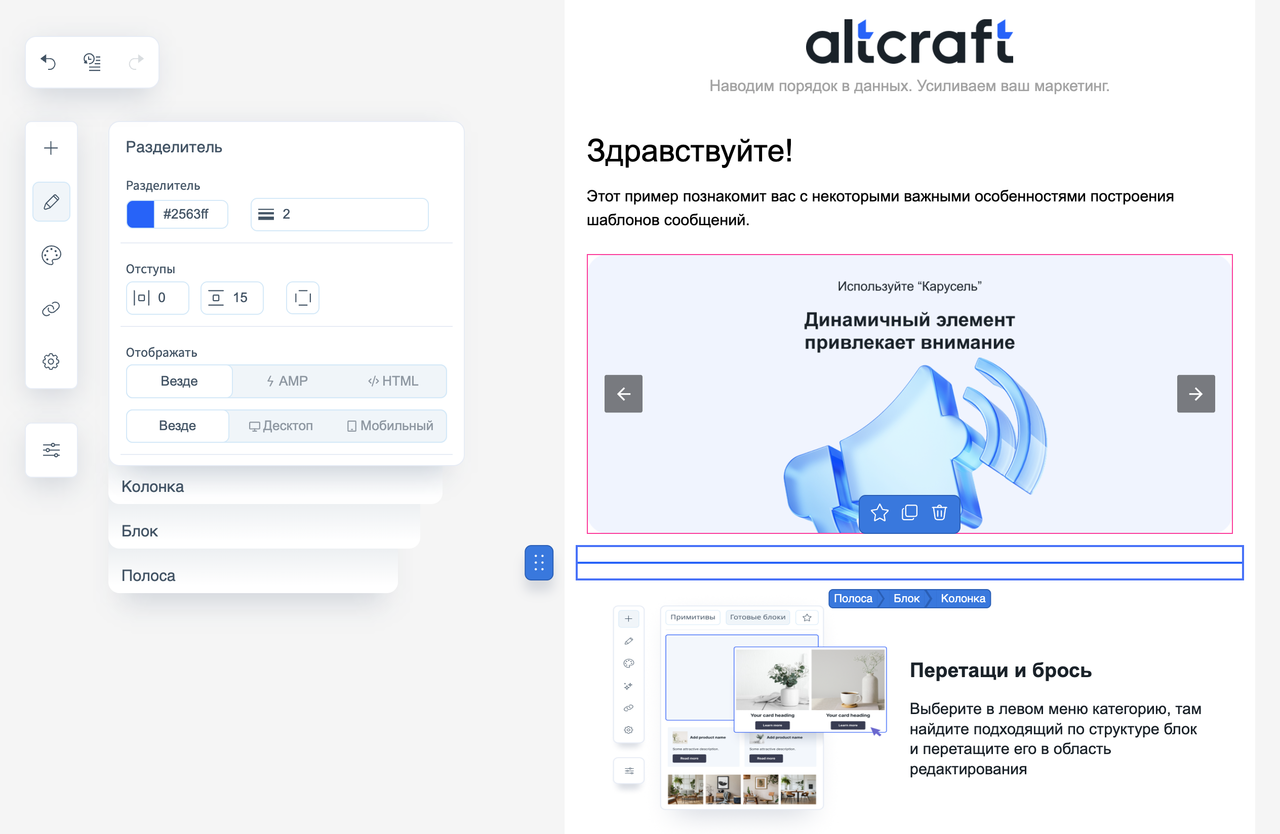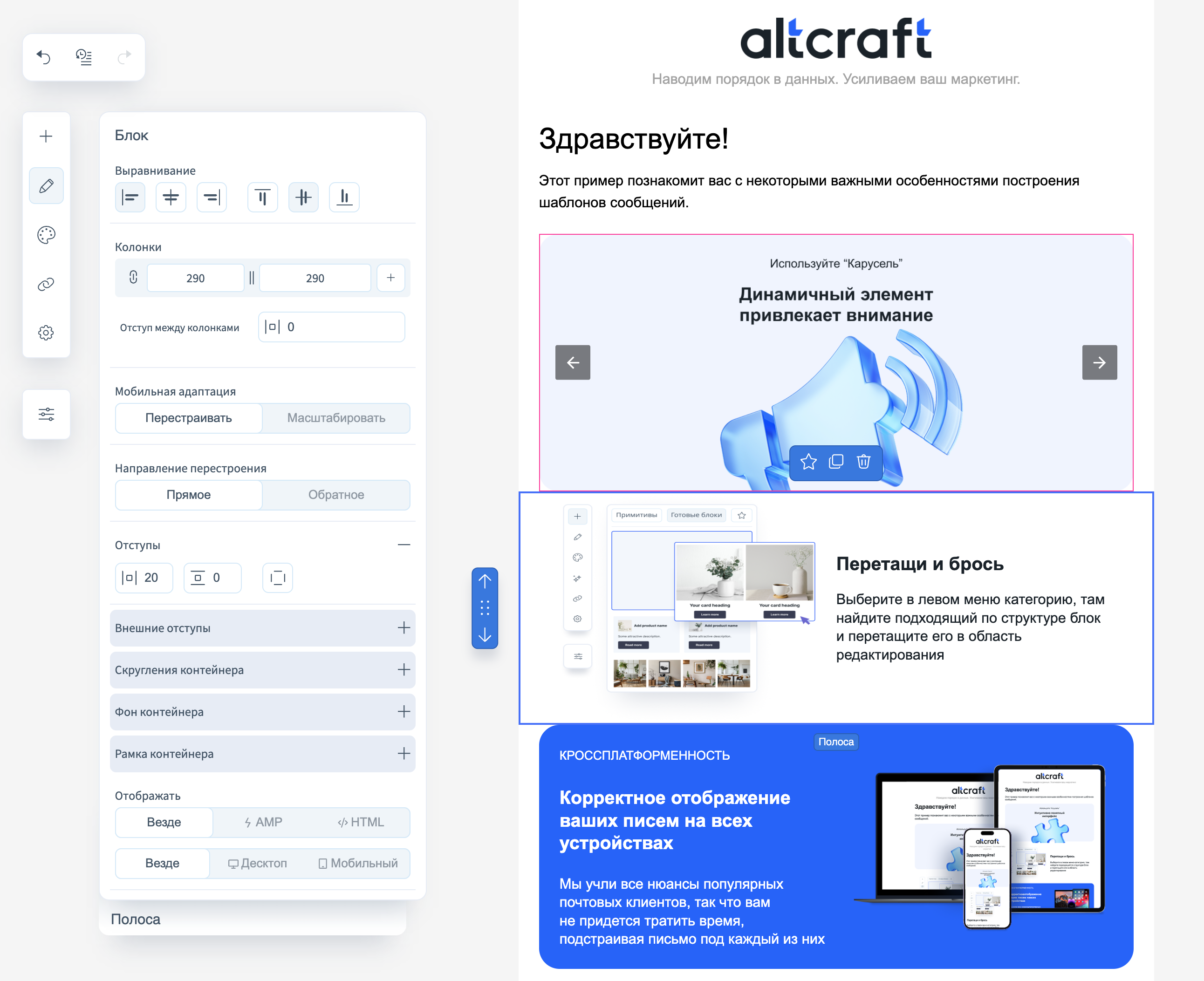 Главная часть редактора, где происходит сборка письма. Сюда можно перетаскивать блоки из рабочей панели. Каждый элемент подсвечивается границами и может быть изменён напрямую.