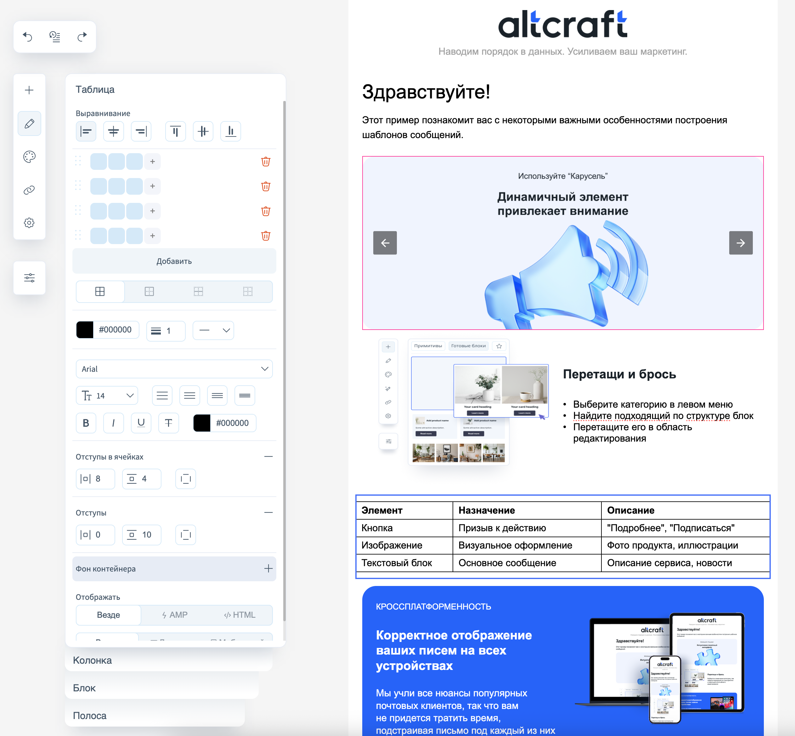Блочный редактор для email-шаблона — это инструмент для создания, редактирования и настройки маркетинговых email—шаблонов и писем без необходимости написания кода. Он предназначен для маркетологов и дизайнеров, которые хотят быстро собирать профессиональные письма с помощью удобного интерфейса, используя блоки, визуальные элементы и настройки дизайна.