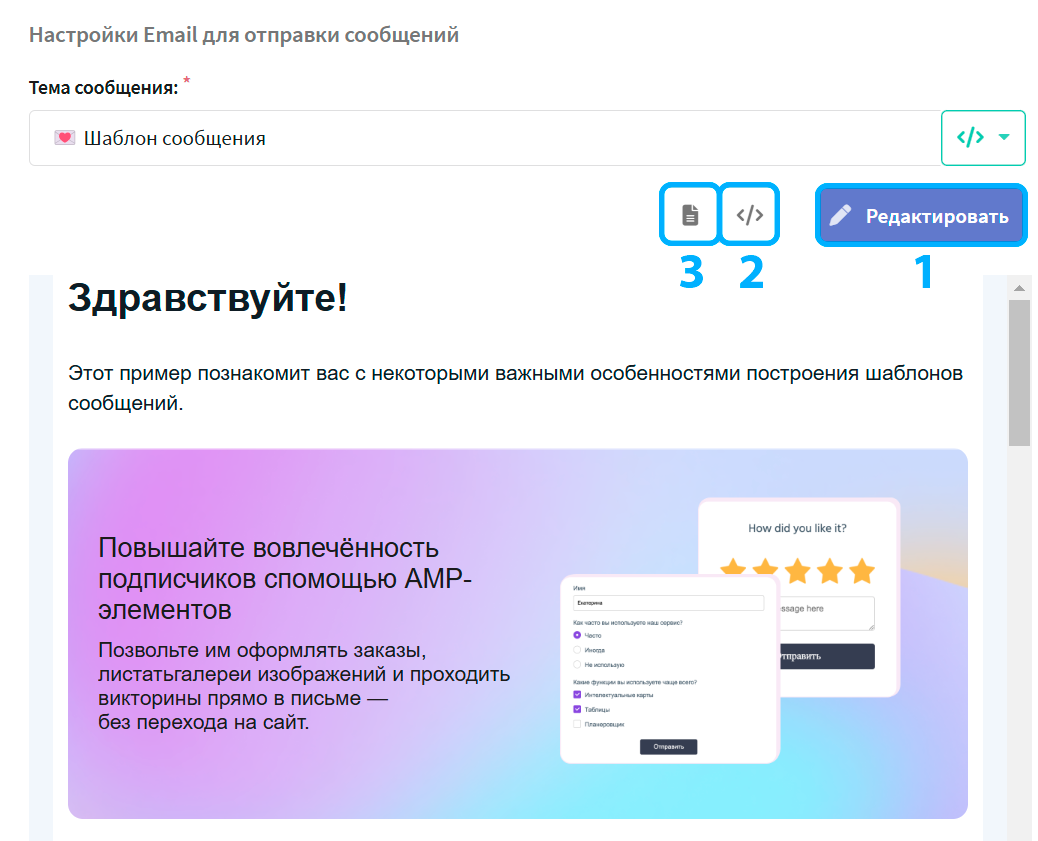 Кнопка "Редактировать" — позволяет вернуться в редактор и внести изменения в шаблон;