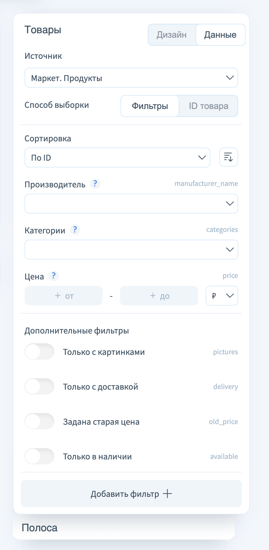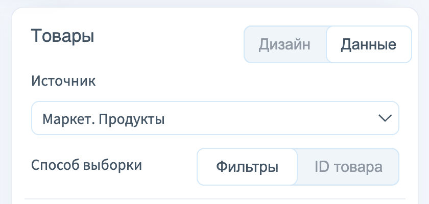 - ID товара — режим ручного выбора конкретных товаров по их идентификаторам. Подходит, если нужно отобразить фиксированные позиции, не зависящие от обновлений ассортимента.