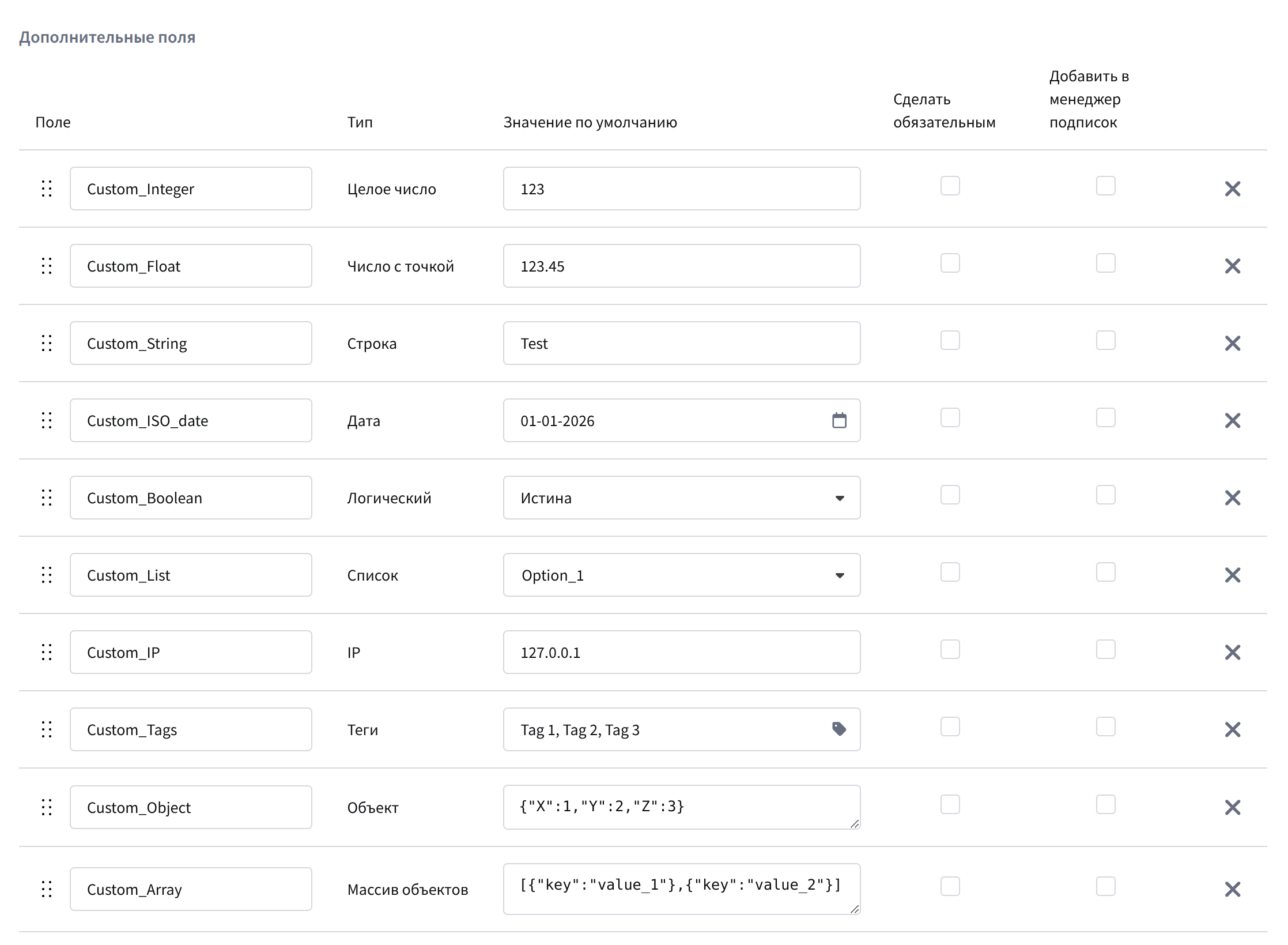 Такие поля могут содержать данные 10 типов для реализации различной бизнес-логики: