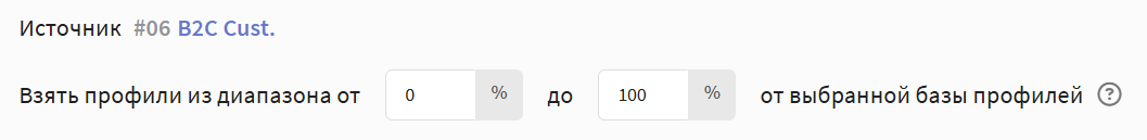 • Диапазон определяет часть базы, к которой будут применены условия сегментации. По умолчанию диапазон равен 100%, т.е. если в базе 1000 профилей, то условия сегментации применятся ко всем профилям в базе. Если, например, вы установите диапазон от 10 до 50%, то условия будут применены к примерно 400 профилям, выбранным равномерно из всего объема базы.