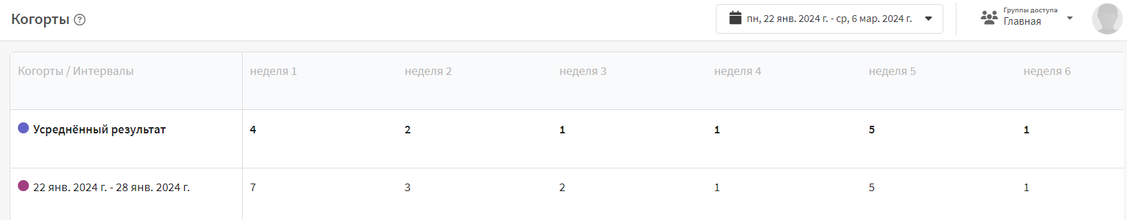 В таблице под графиком отображаются показатели активности по всем группам подписчиков за выбранный период (в зависимости от Значения когорты), а также усредненный результат.