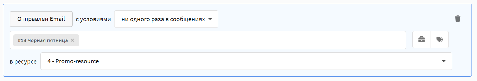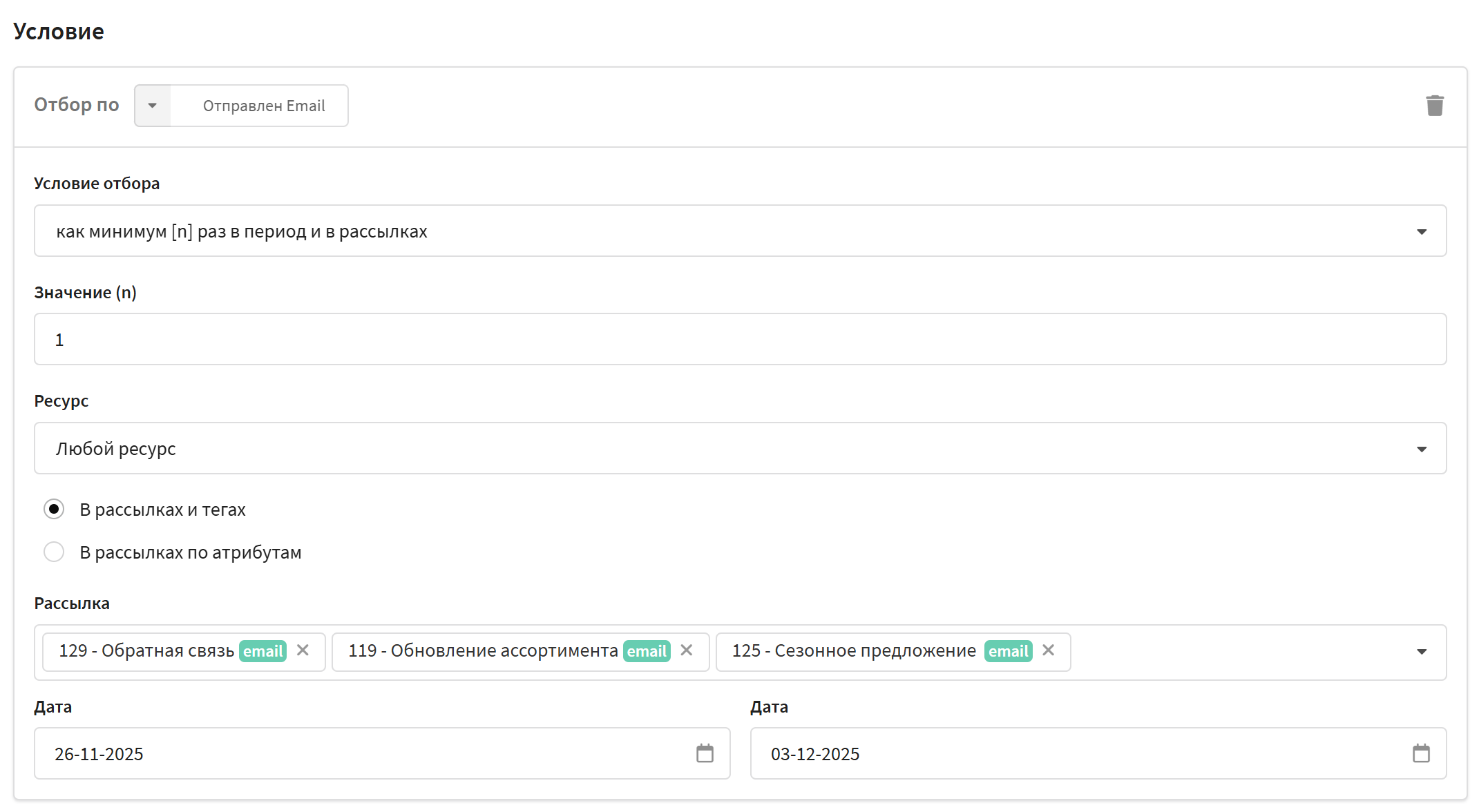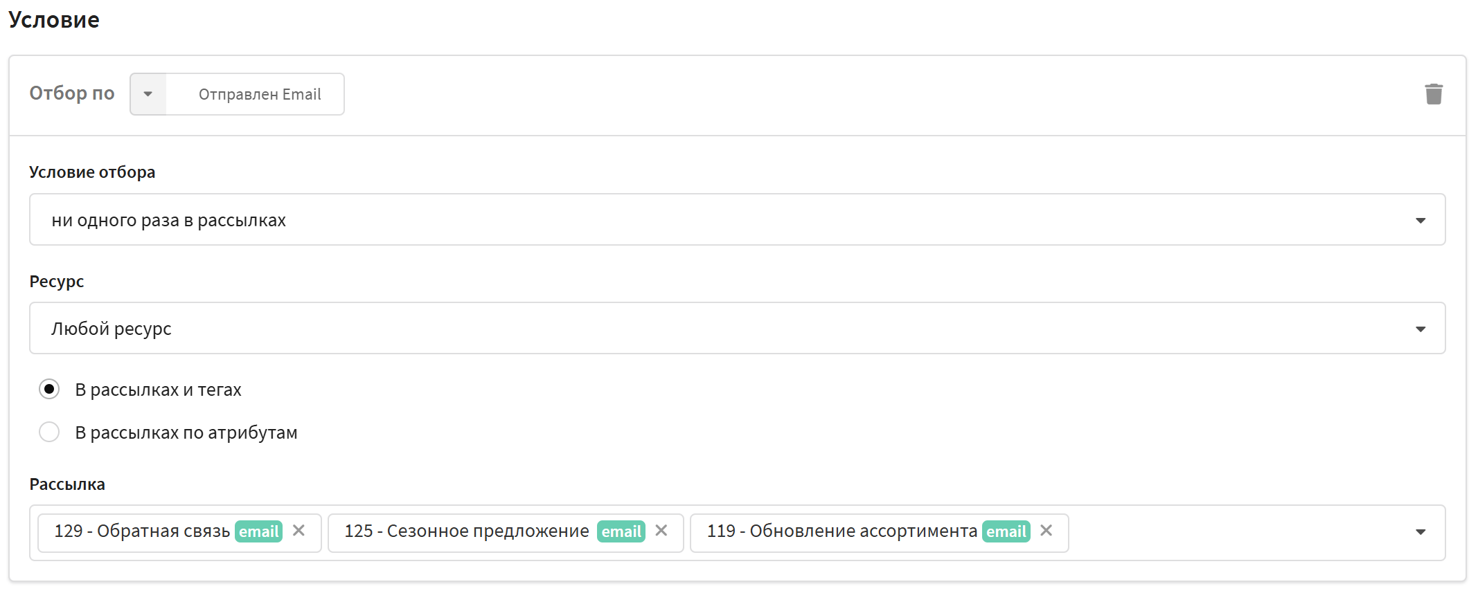 - Ни одного раза — выборка по отсутствию хотя бы одного действия выбранного типа. В зависимости от оператора можно дополнительно указать Рассылку, Сообщение, период времени или количество дней с текущей даты.