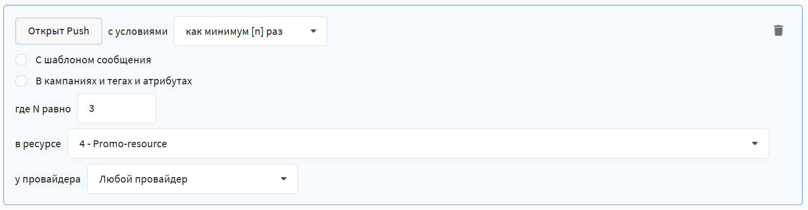 - Как минимум [n] раз — выборка по наличию указанного количества событий у подписчиков. В зависимости от оператора можно дополнительно указать Рассылку, Сообщение, период времени или количество дней с текущей даты.