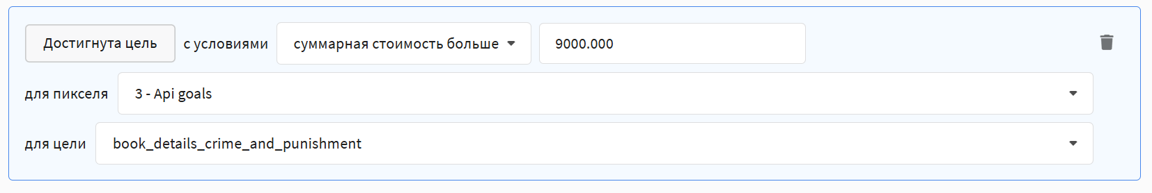 2. Суммарная стоимость — такие операторы будут рассчитывать сумму стоимости достигнутых подписчиками целей и сравнивать с заданной в правиле. Доступны варианты больше / меньше / равна. Расчёт может проводиться за всё время, за период или за последние [x] дней.