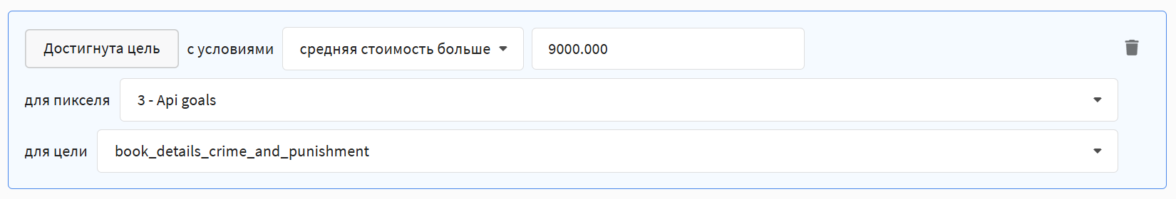 3. Средняя стоимость — такие операторы будут рассчитывать среднее арифметическое стоимости достигнутых целей и сравнивать с заданным в правиле значением. Доступны варианты больше / меньше / равна. Расчёт может проводиться за всё время, за период или за последние [x] дней: