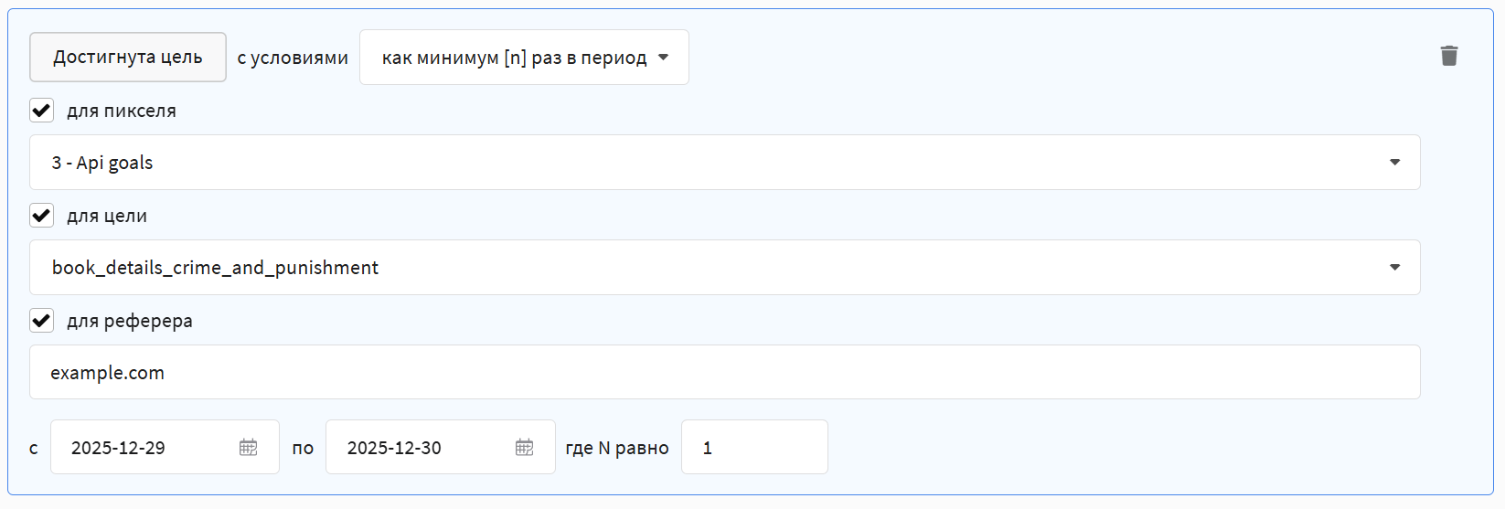 4. Как минимум [n] раз / Ни разу — операторы для выборки количества и частоты совершаемых действий. В зависимости от необходимой логики, можно уточнить в правиле цель, пиксель или реферера (источник трафика):