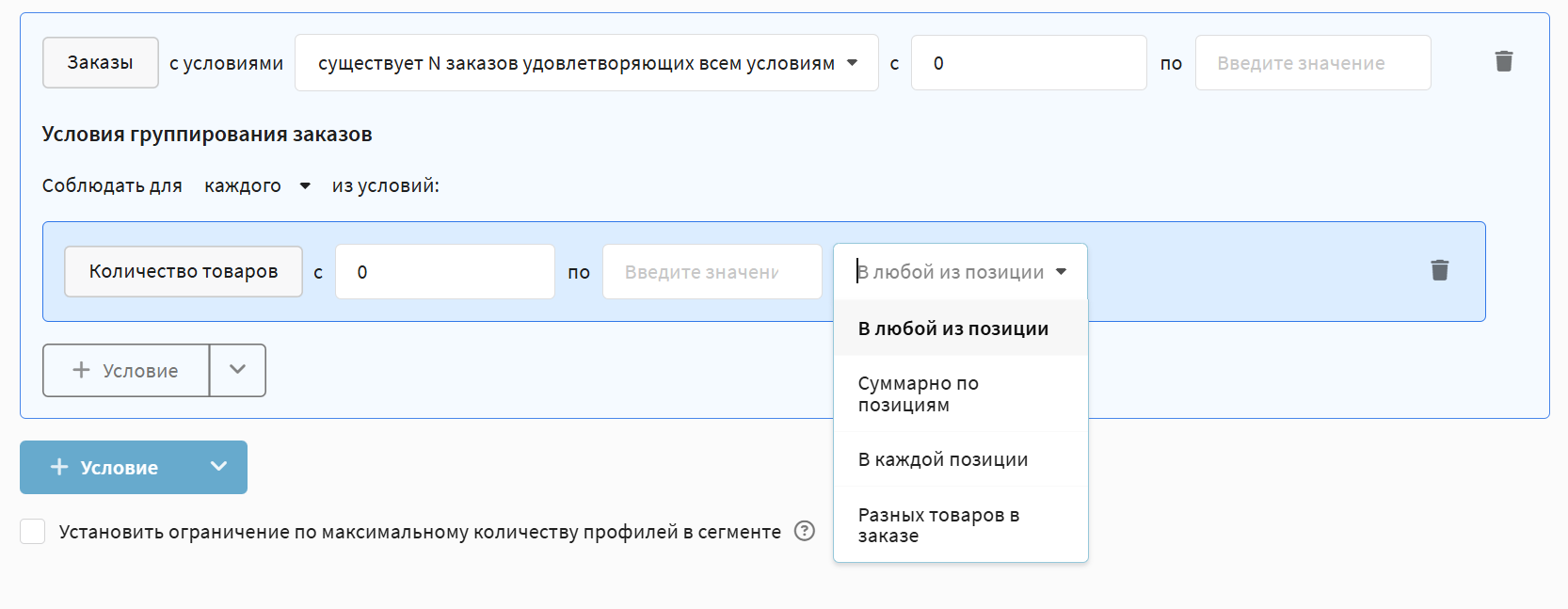 Условие группирует заказы, совершенные в одном канале продаж. Можно указать несколько точек контаков.
