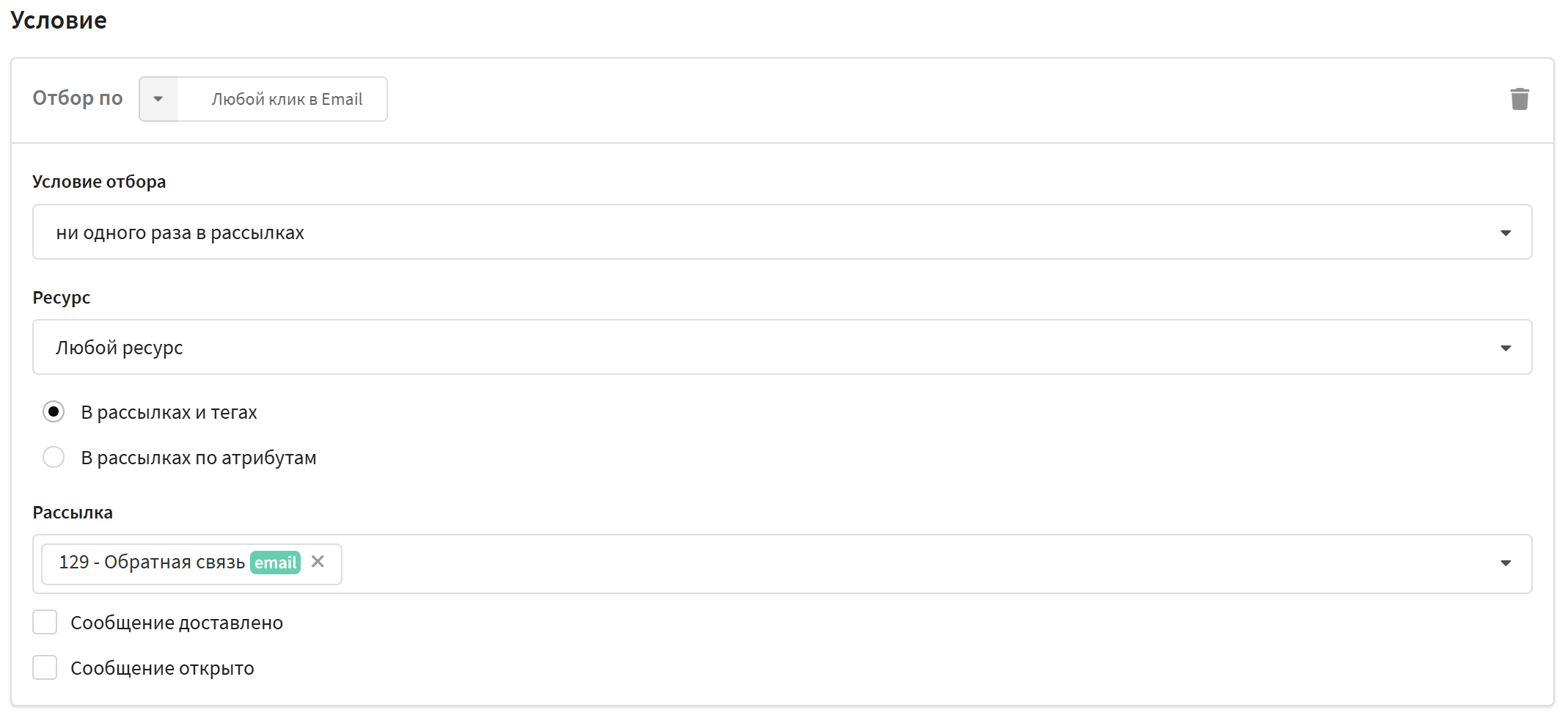 На изображении ниже условие выберет тех, кто не кликнул в рассылке #129. При этом выборка будет происходить только среди профилей, которым рассылка была доставлена.