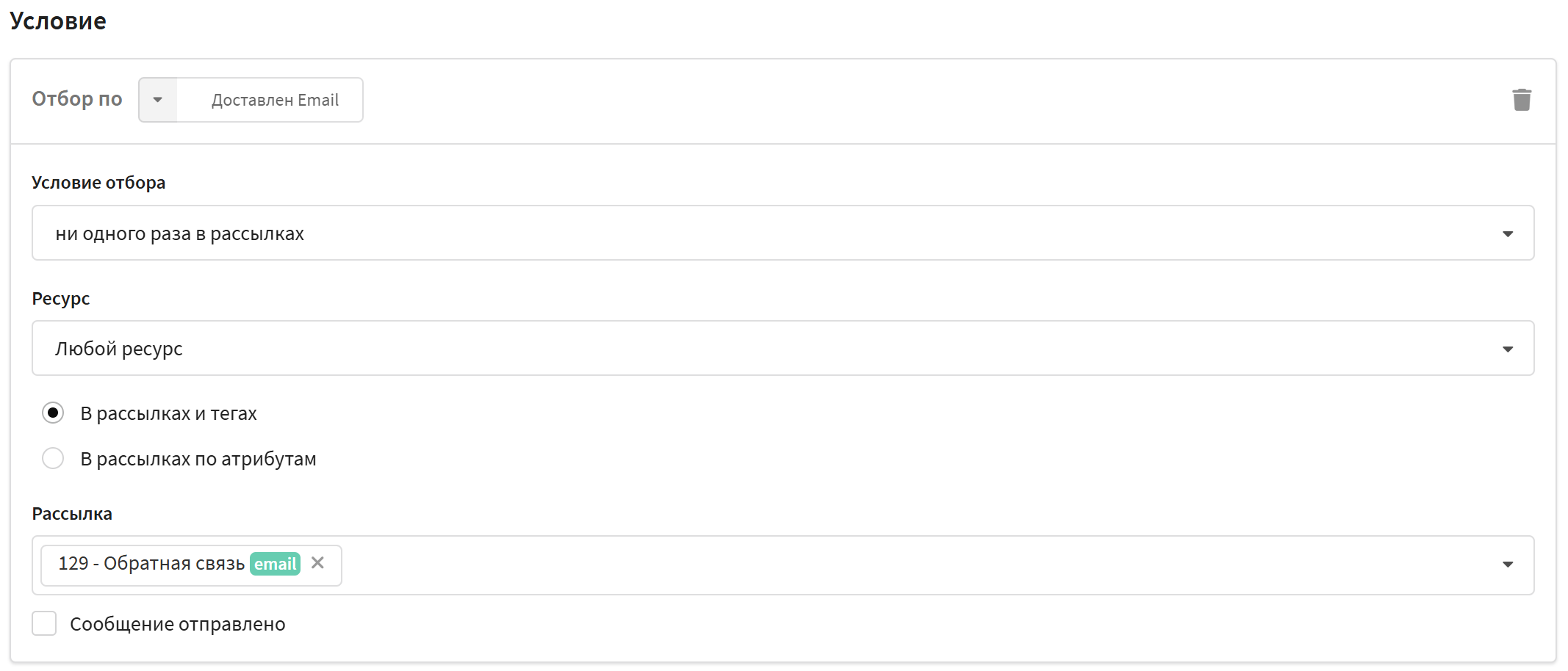 Правила выборки по доставке могут использоваться в различных сценариях. Например, если нужно определить, кто из получивших сообщение клиентов не открывал его, или кому из подписчиков сооб щение не было доставлено при временной недоступности email или телефона.