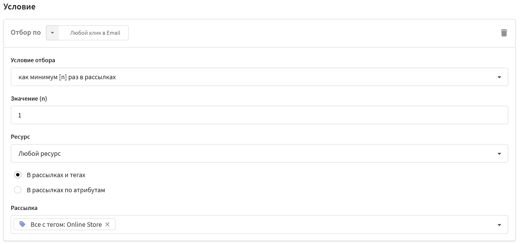 При сегментации по событиям в рассылке или в сообщении также доступен отбор по тегам и по атрибутам. В примере ниже будут выбраны профили, кликнувшие в любой рассылке с тегом "Online store":