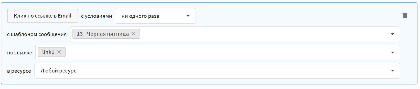 Выбранные шаблоны и ссылки комбинируются по логике ИЛИ: условие считается выполненным, если в любом из указанных шаблонов произошёл клик по любой из выбранных ссылок.