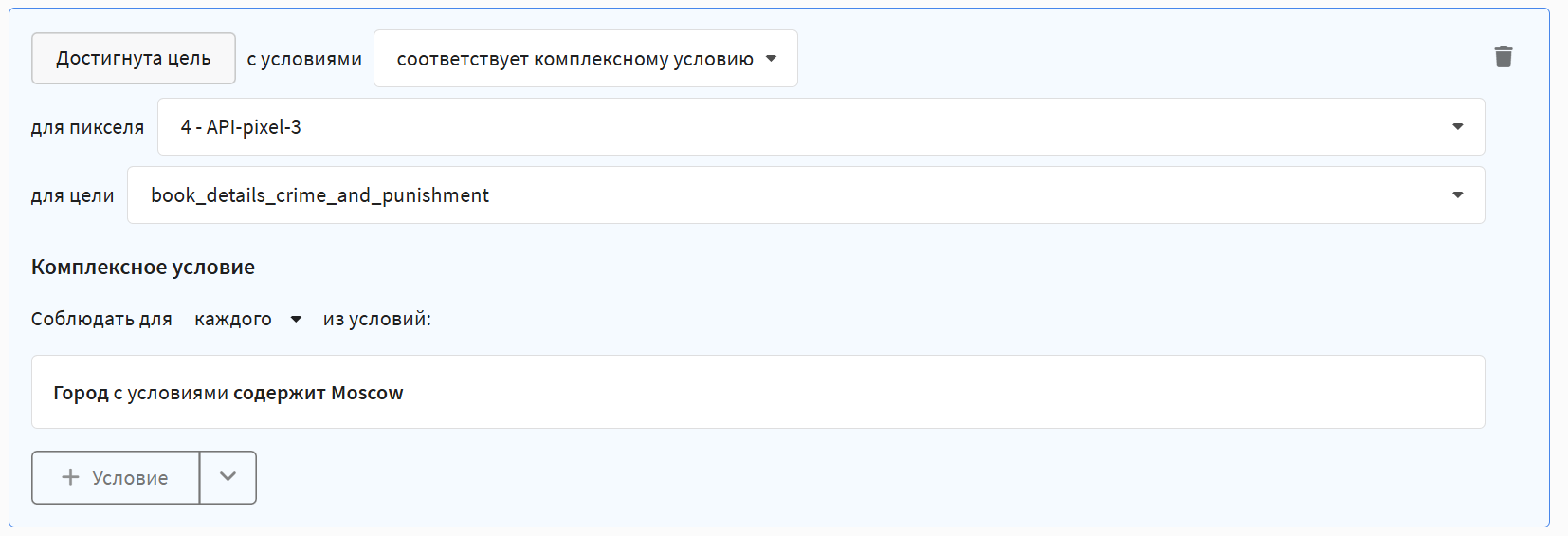 Правило "Соответствует / Не соответствует комплексному условию" позволяет выбирать профили на основе этих данных. Чтобы настроить условие, введите название цели или выберите цель из списка, нажав на