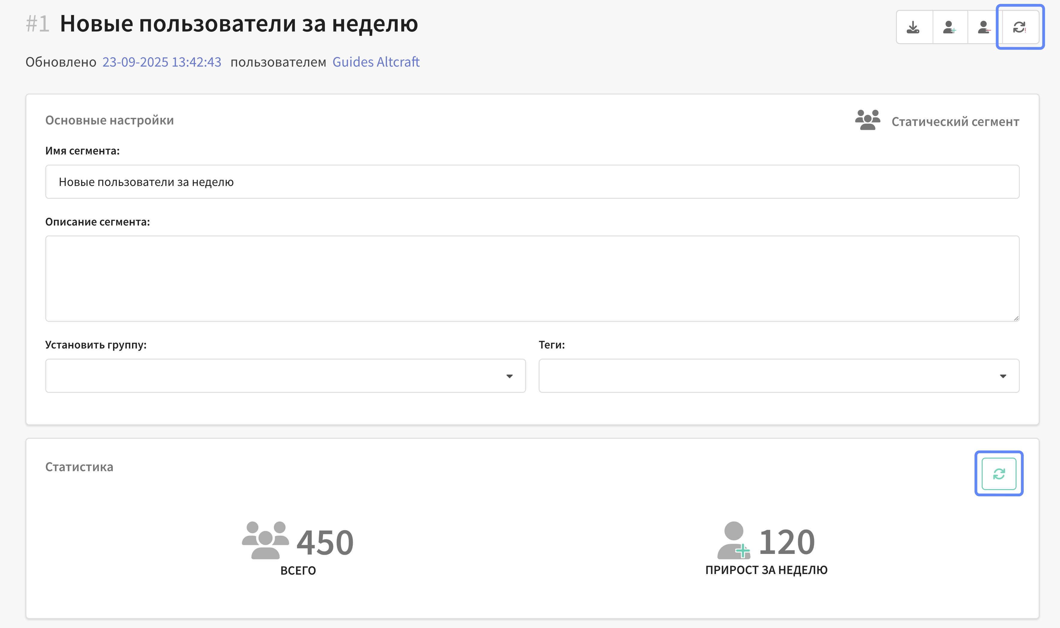 Кнопку в блоке "Статистика" используйте только для обновления числовых показателей — она не влияет на состав сегмента.