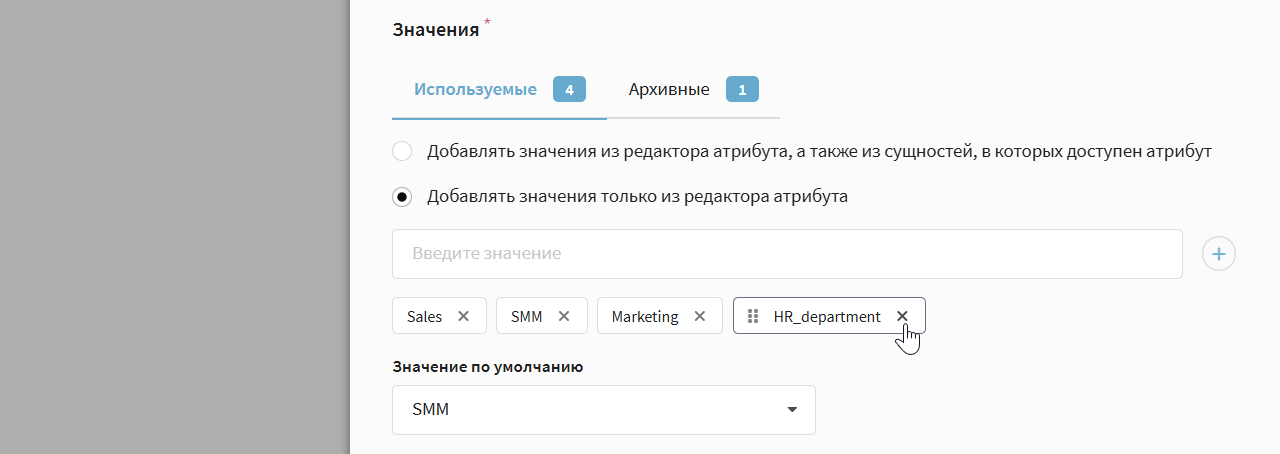 Архивированное значение нельзя добавить новым сущностям, но оно сохраняется в уже существующих и может использоваться при фильтрации и поиске. Такие значения отмечаются специальным образом: