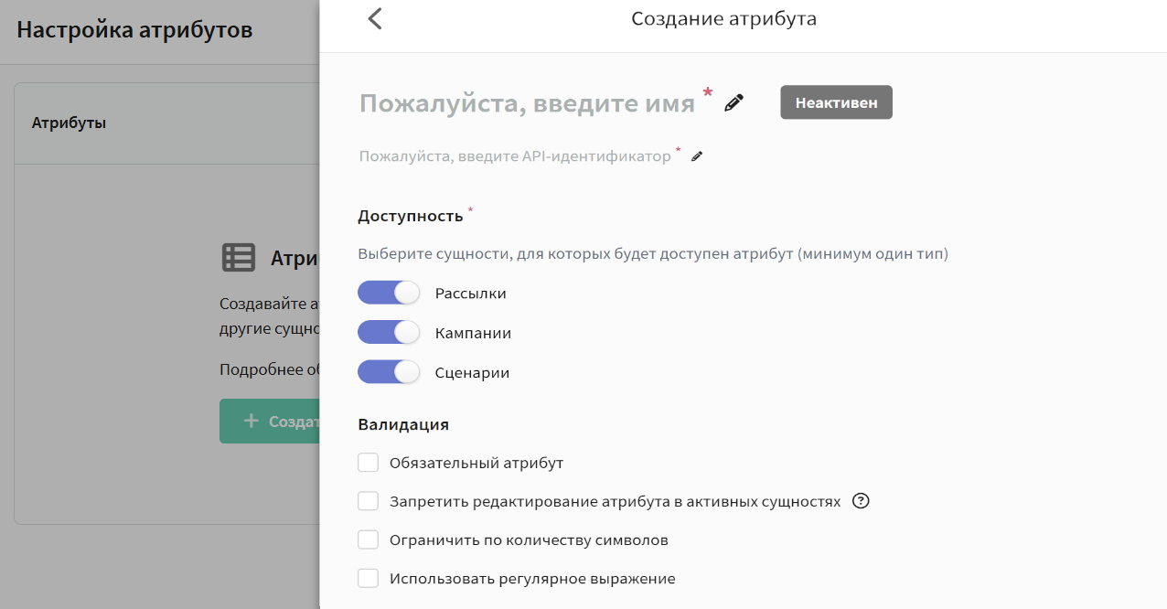 Появится окно с настройками атрибута. Прежде всего задайте для него название и API-идентификатор. Далее отметьте те сущности, для которых будет доступен атрибут — кампании, рассылки или сценарии (как минимум один тип сущности):