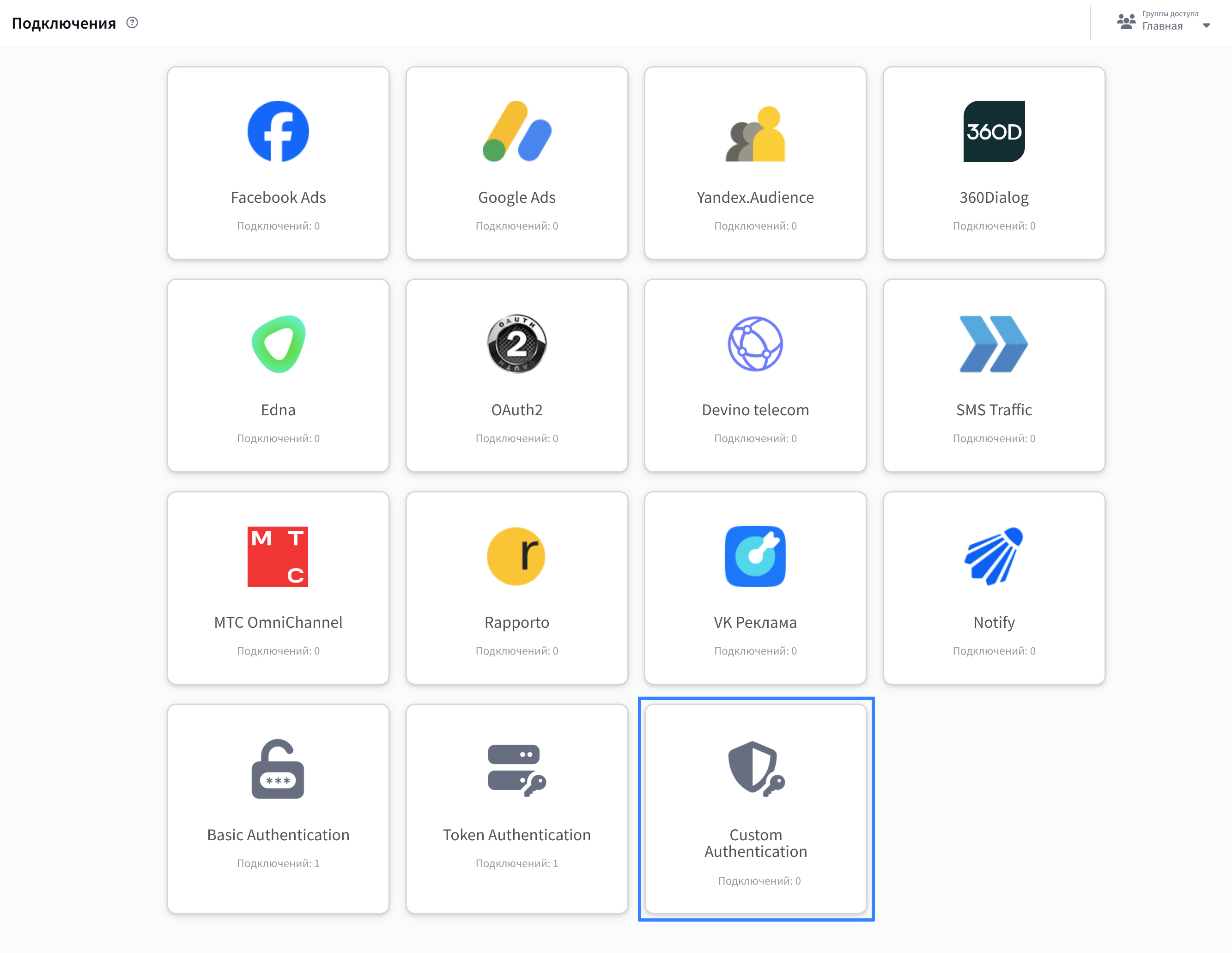 Откроется список всех настроенных Custom-подключений. Чтобы добавить новое, нажмите + Создать.