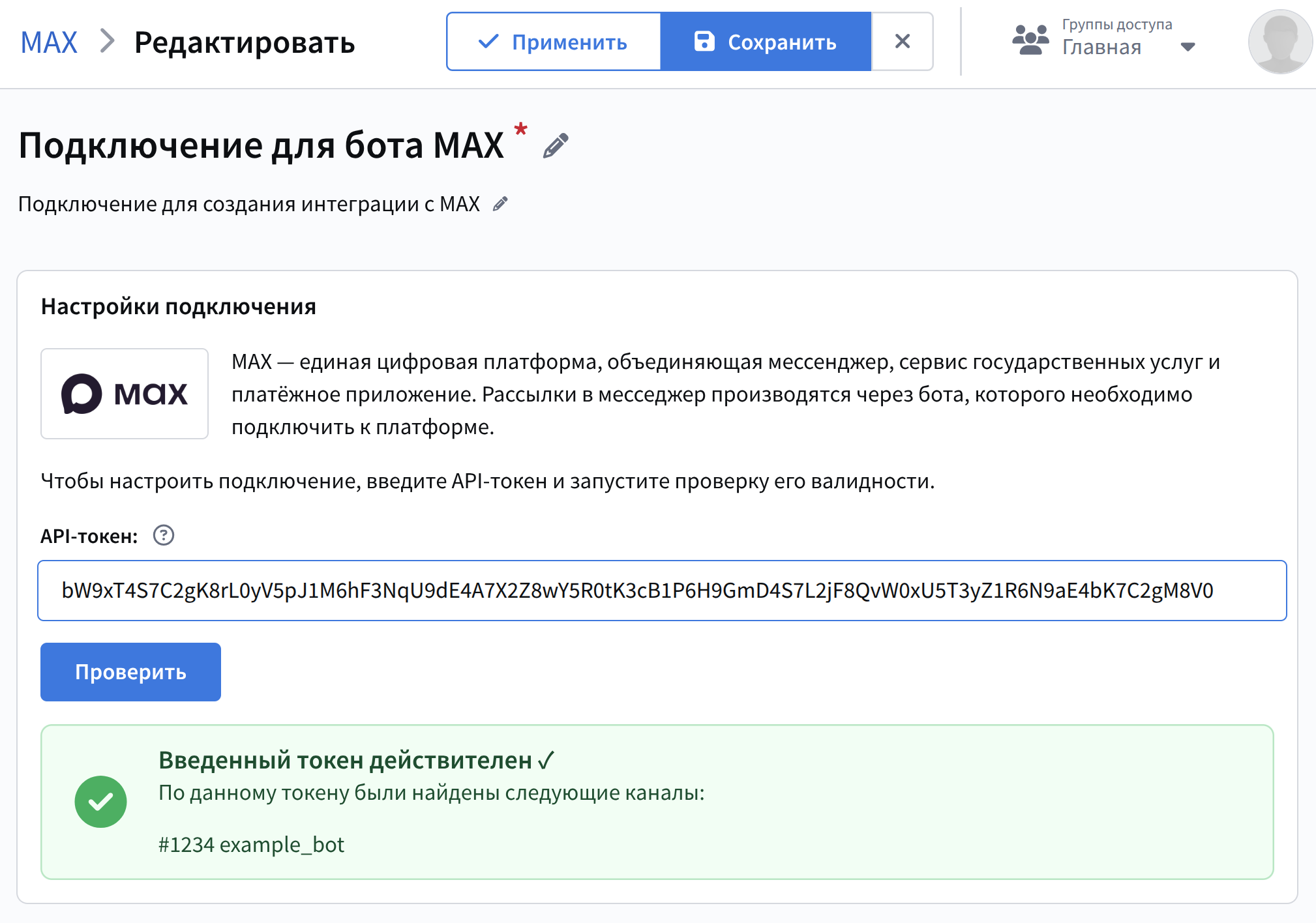 Сохраните подключение, нажав на кнопку Сохранить. После этого можно переходить к настройке интеграций с MAX.