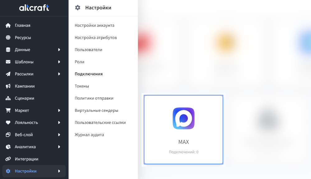 Затем перейдите в платформу Altcraft. Откройте Настройки — Подключения. Выберите тип подключения — MAX: