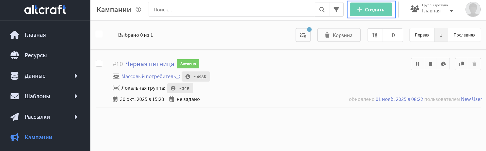 Откройте раздел Кампании в главном меню и нажмите + Создать в списке кампаний: