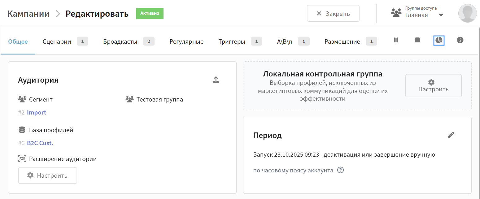 Чтобы избежать задержек и ошибок в работе кампании, настройте контрольную группу заранее, а уже потом активируйте кампанию.