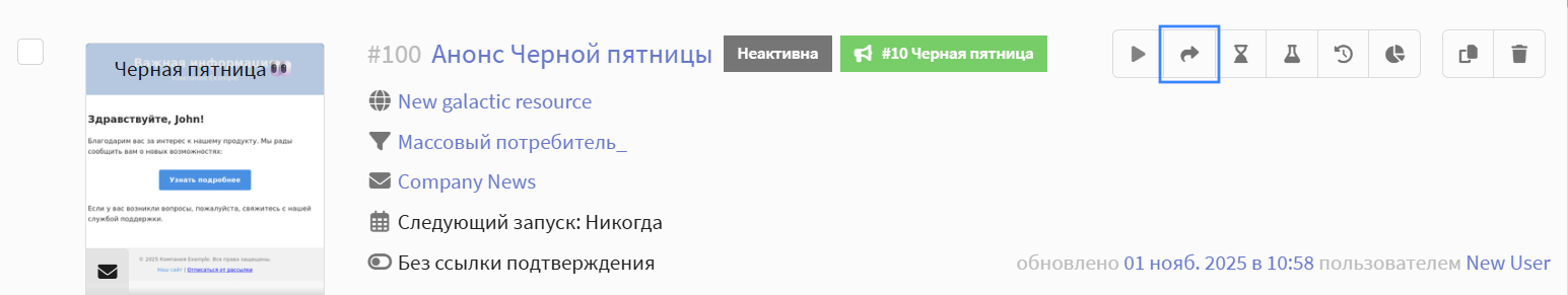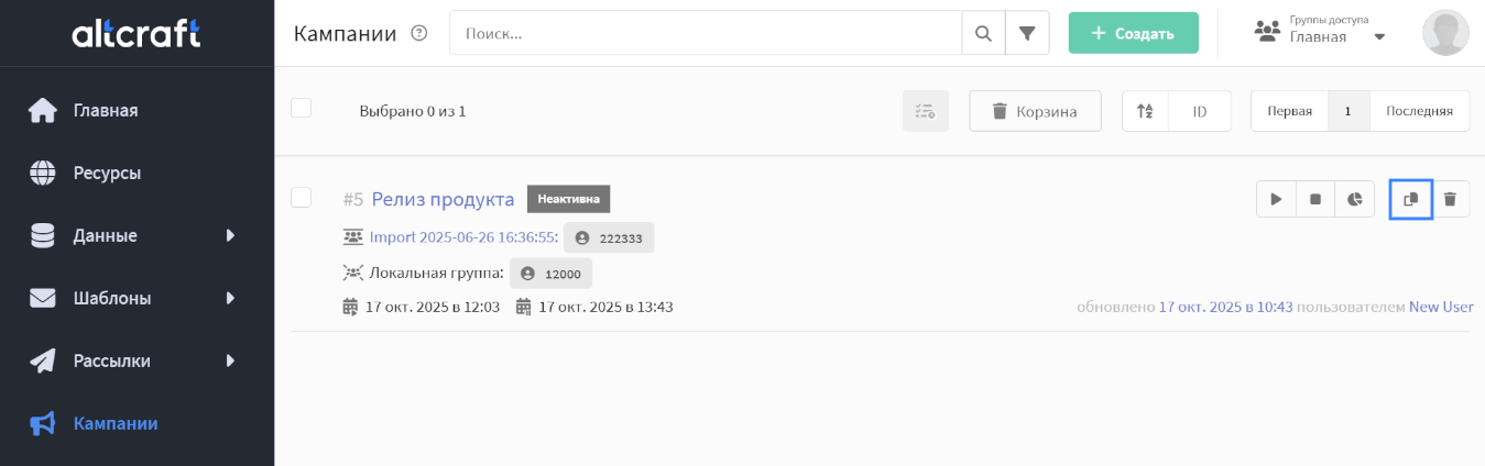 Чтобы клонировать кампанию, в списке кампаний нажмите иконку