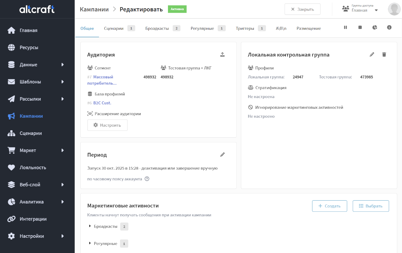 | Активна | Кампания запущена, аудитория рассчитана. Активности работают согласно своим настройкам. |