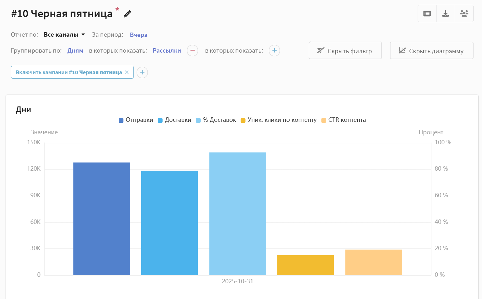 В этом отчёте можно просмотреть показатели по каждой рассылке и сценарию, входящим в кампанию: