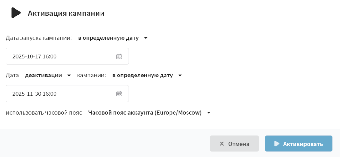 - Активировать в определённую дату — кампания запланирована к запуску в указанное время. Система автоматически активирует кампанию в выбранную дату и время.