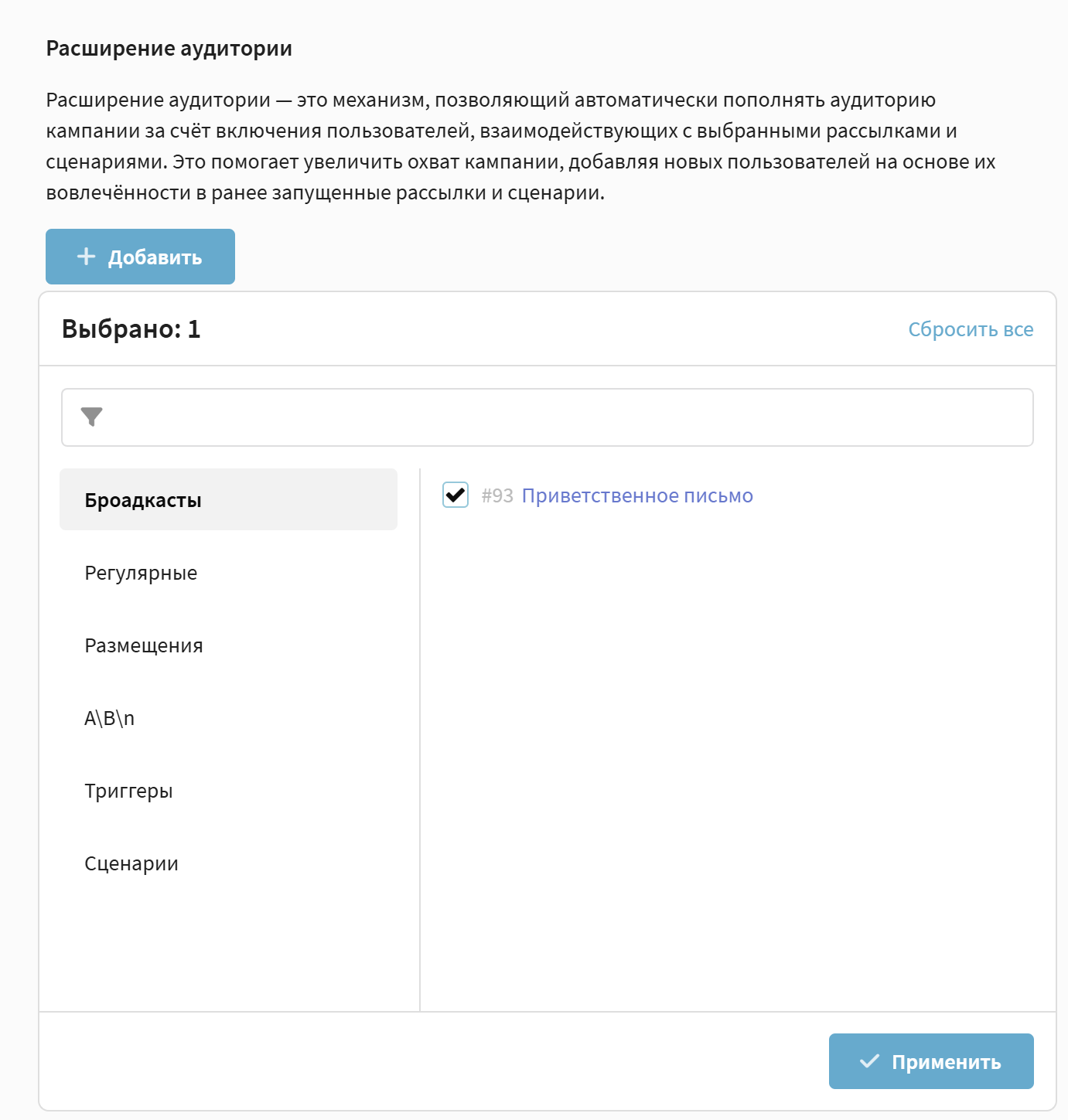 Расширение аудитории — это механизм, который позволяет автоматически добавлять в кампанию новых пользователей, если они участвуют в выбранных активностях.