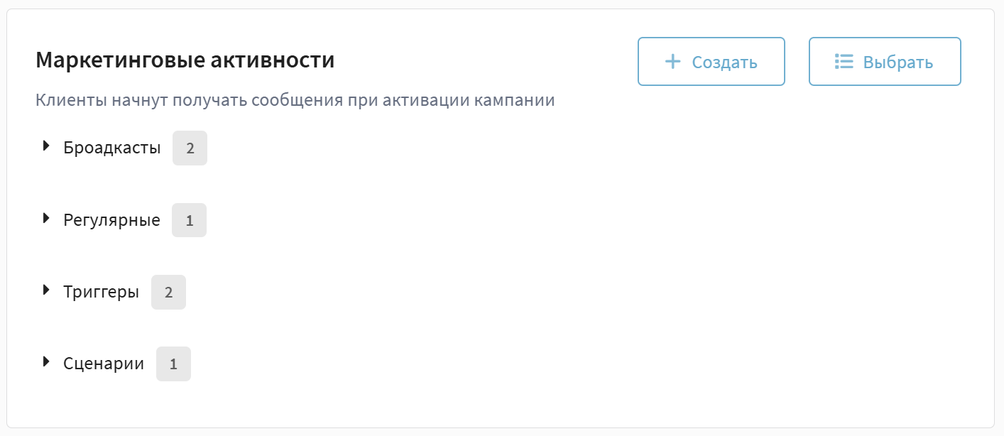 В разделе "Маркетинговые активности" можно управлять всеми активностями, которые входят в кампанию.